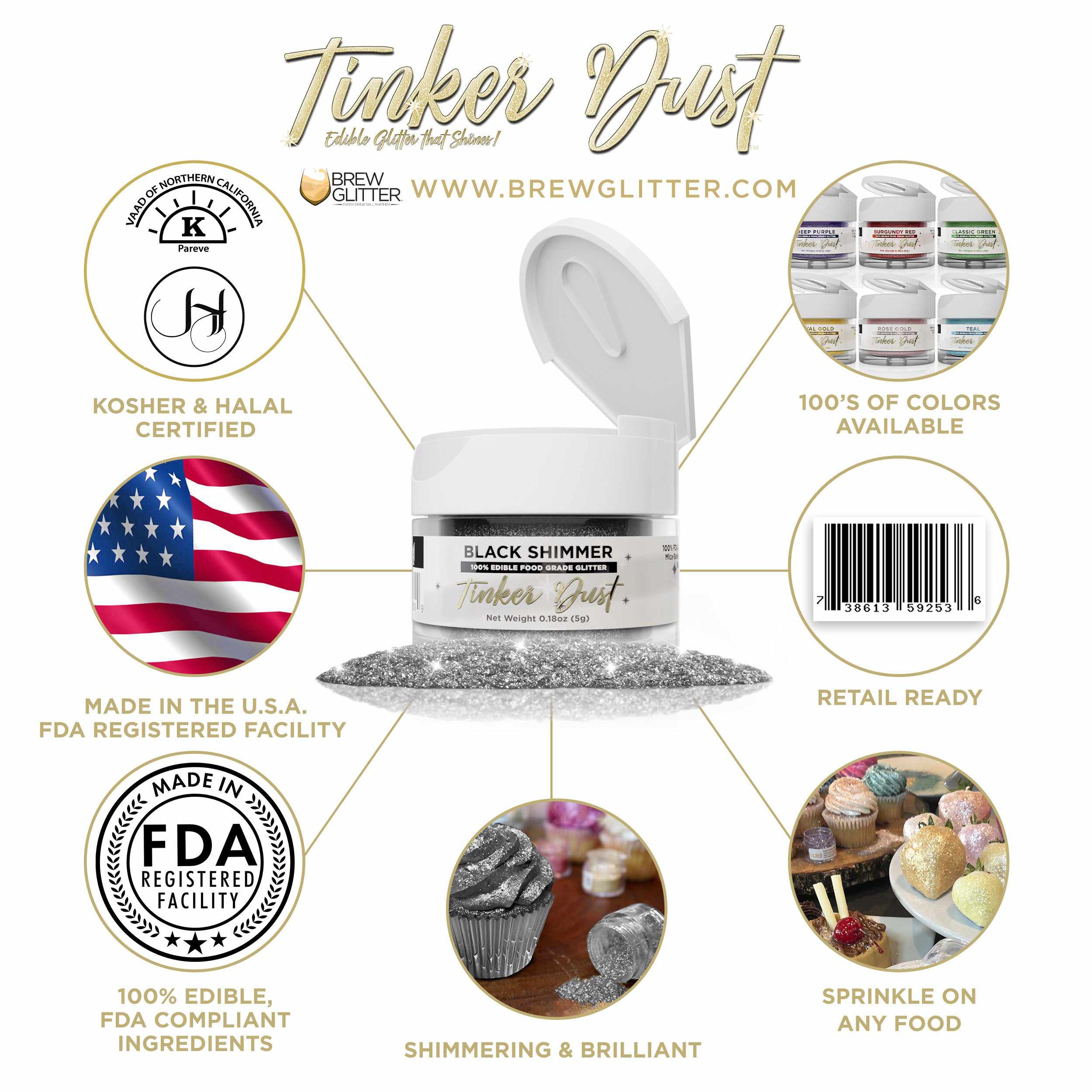 Bakell® offers a range of fully FDA-compliant edible glitters that come in everything from metallic silver to glittery rainbow colors! With Bakell® you can make your cakes sparkle, create a custom icing color palette or make your own unique gelatin treats.