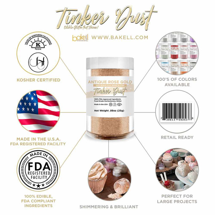 View full detailsTinker Dust® edible glitter is the #1 edible glitter in the world! Trusted all over the world by millions. From professional cake artists like world renown Cake Artist & cover of Cake Decorating Magazine, Sahar Masarati, to the DIY cake & cookie decorating weekend warrior! Our Tinker Dust edible glitters use only FDA approved ingredients, are Kosher Pareve certified, 100% edible, vegan, non-gmo, gluten free, dairy free, nut free & guilt free! Tinker Dust® is a potent, shiny, beautiful edible glitter that will add a WOW factor to any food, drink or confectionery creation!